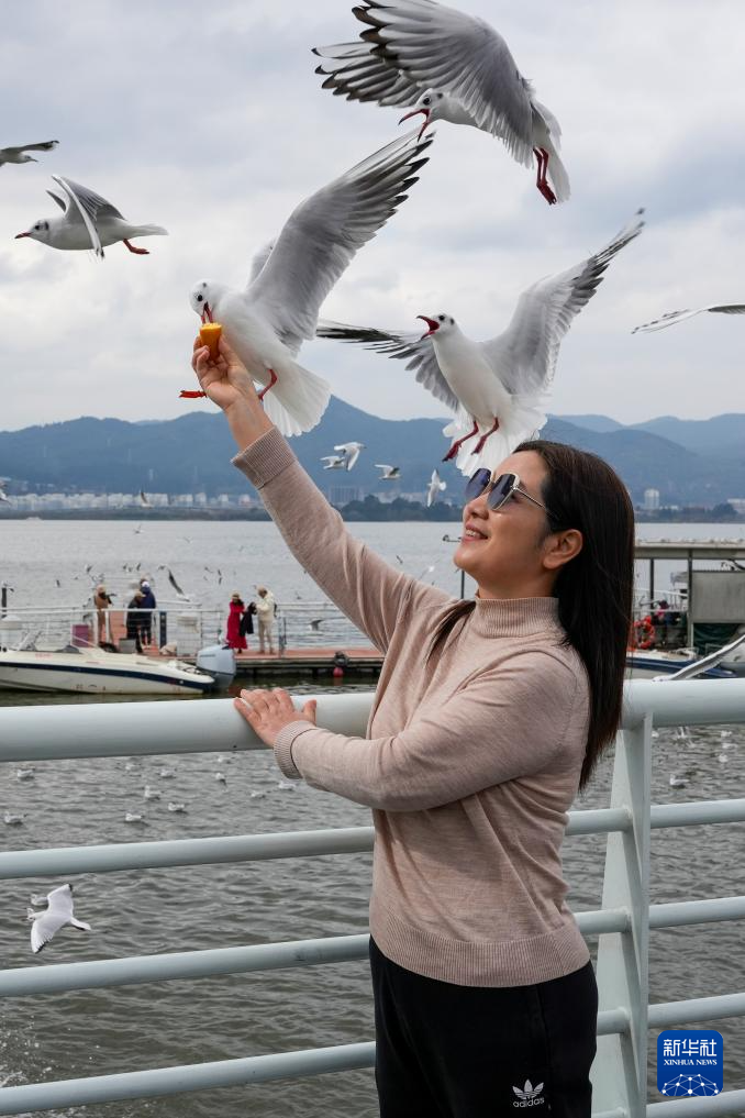12月19日,游客在云南省昆明市海埂公园与红嘴鸥互动。