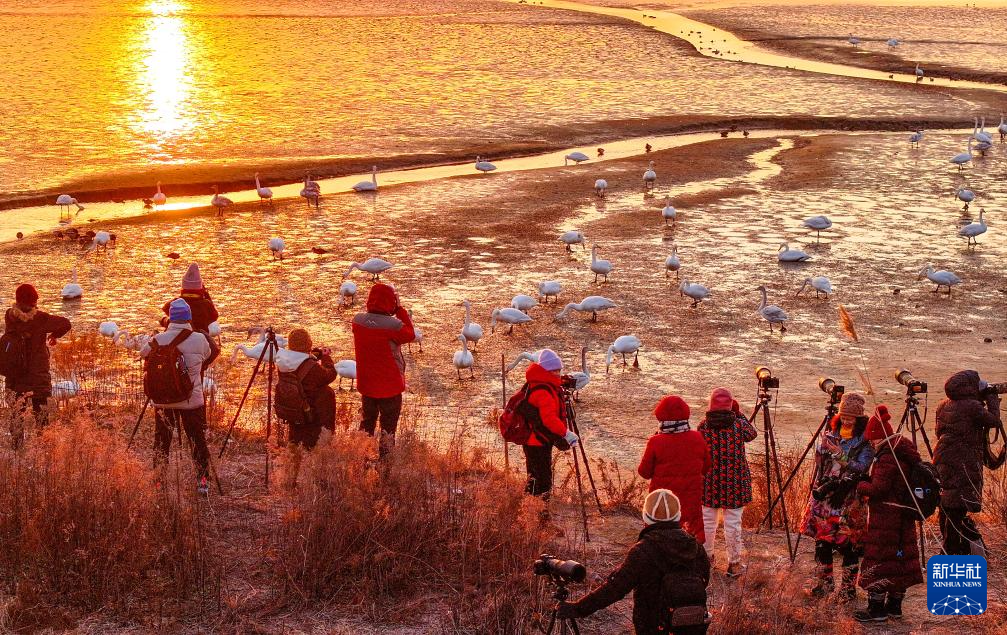 12月20日,在山东省荣成市天鹅湖湿地摄影区,摄影爱好者在拍摄大天鹅。