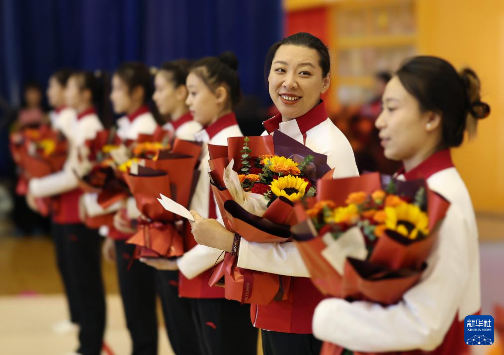 12月20日,中国艺术体操队队员郭崎琪(右)在登榜仪式上向代表艺术体操老前辈致辞的张慧琴献花。
