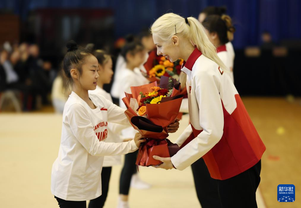 12月20日,中国艺术体操队小队员在登榜仪式上向教练阿纳斯塔西娅·布利兹纽克献花。