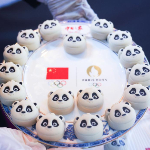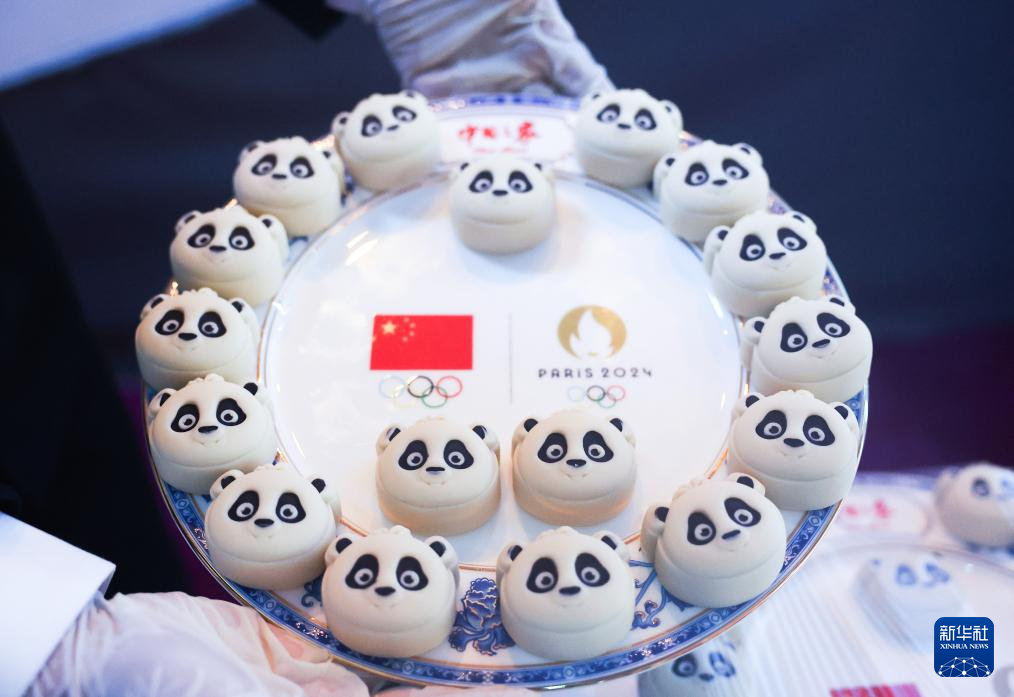 这是8月7日在法国巴黎奥运会“中国之家”举行的答谢日暨中法美食文化交流会现场拍摄的中国美食熊猫月饼。