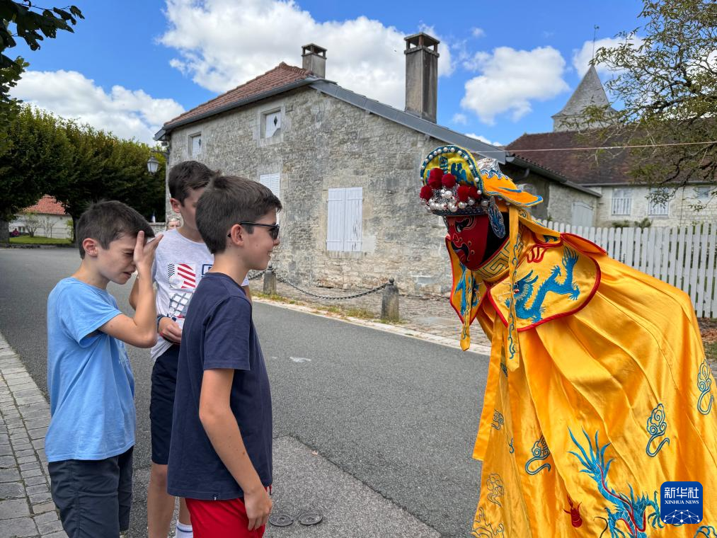 8月10日,来自中国湖南省韶山市的艺术家李雄(右)在法国科龙贝双教堂村的乡村艺术节上表演变脸。