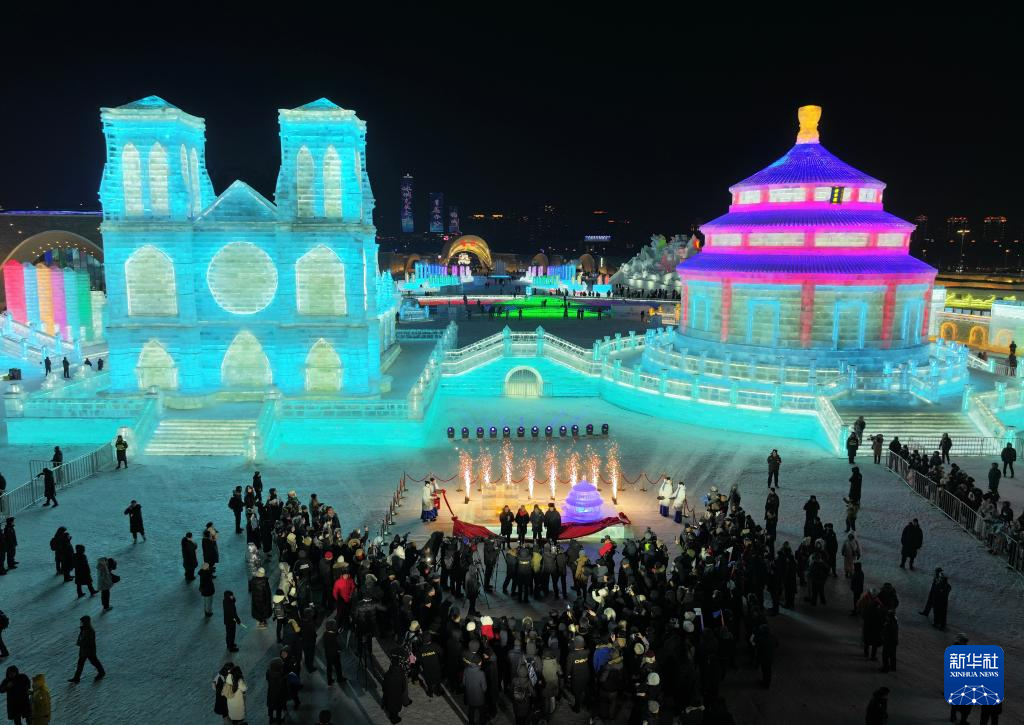 1月5日,中法两国嘉宾在中国黑龙江省哈尔滨冰雪大世界共同为北京天坛和巴黎圣母院冰雕揭幕。这是中法文化旅游年开幕式活动的重要环节之一,两座巨型冰雕色彩斑斓、熠熠闪光,吸引众多游客“打卡”。