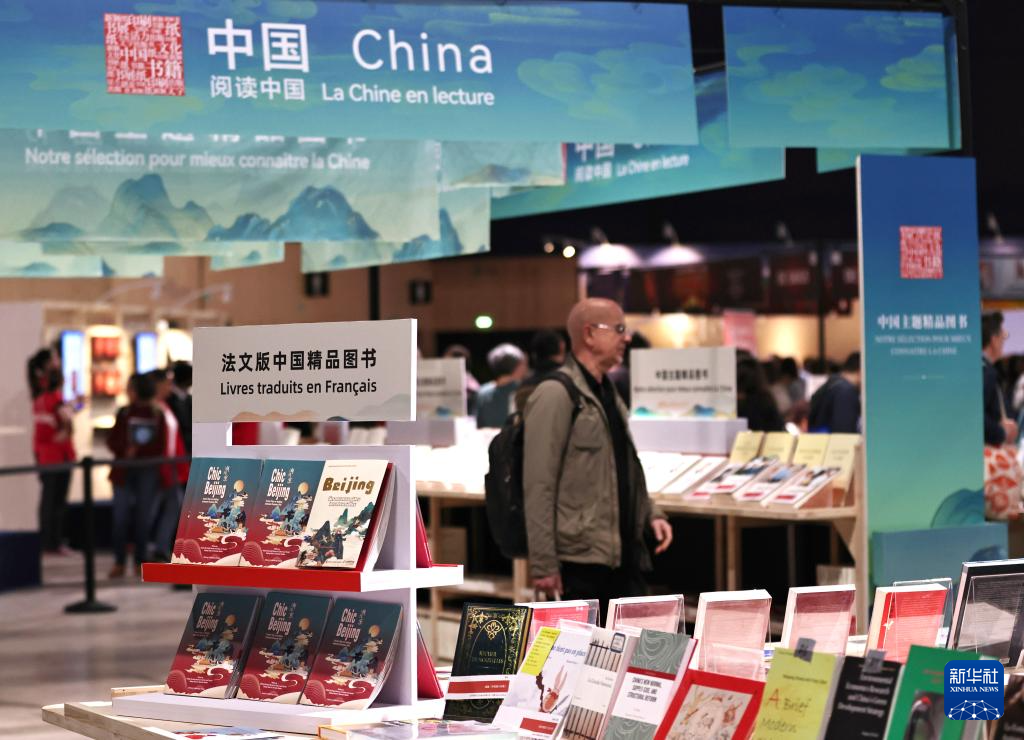 这是4月12日在法国巴黎临时大皇宫举行的2024巴黎书展上拍摄的中国图书展区一角。