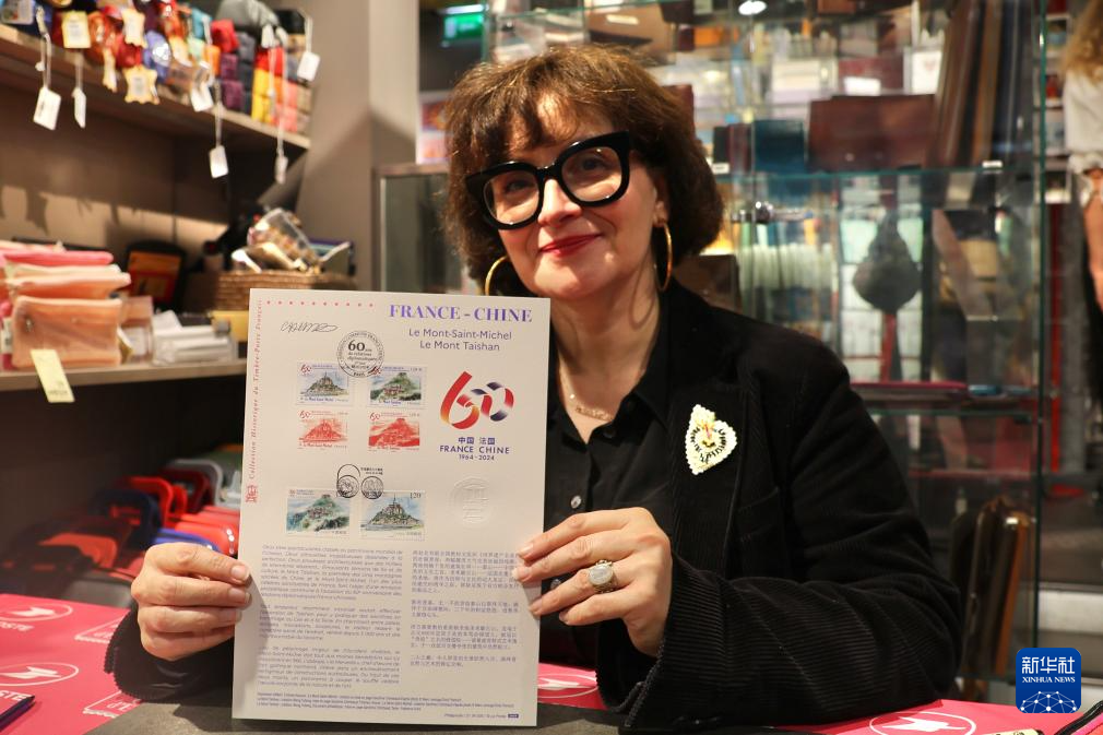 10月18日,在法国巴黎举行的《中法建交六十周年》纪念邮票首发仪式现场,邮票设计者之一、法国艺术家桑德里娜·尚博展示邮品。