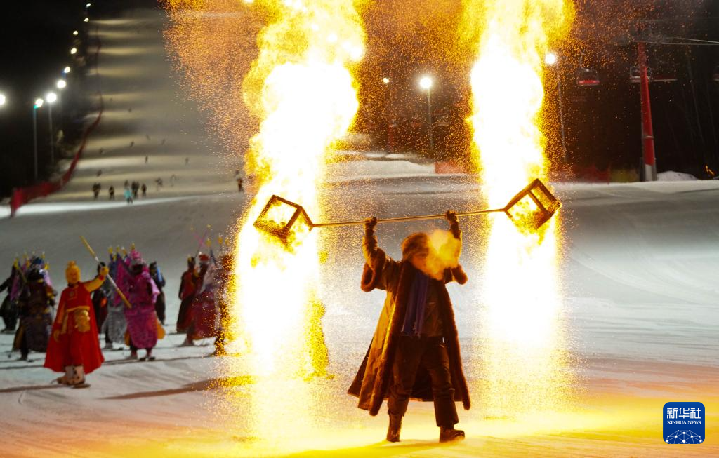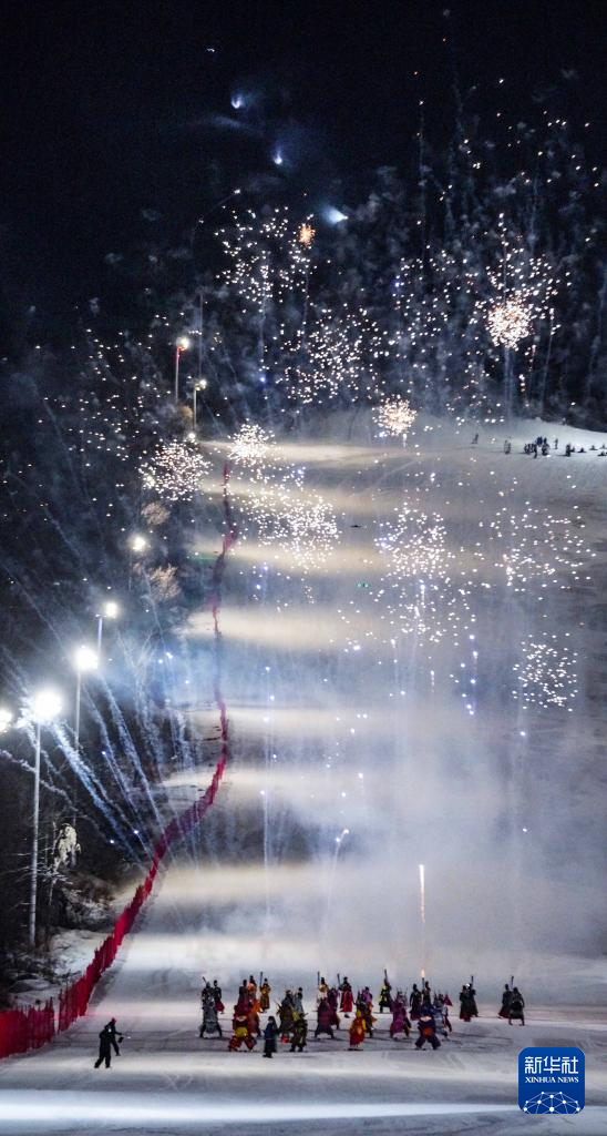 12月19日,表演者在第二届世界寒地冰雪经济大会进行夜滑表演。