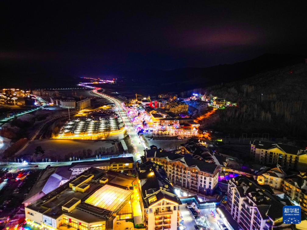 这是12月19日拍摄的吉林市北大湖滑雪度假区商业街夜景(无人机照片)。