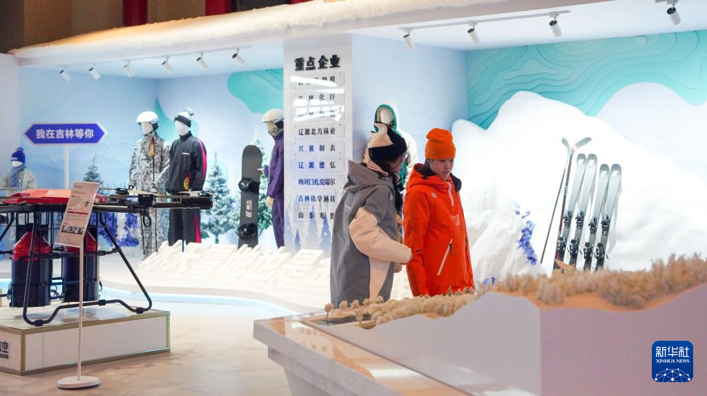 12月19日,游客在吉林市北大湖滑雪度假区内的冰雪装备展区参观。