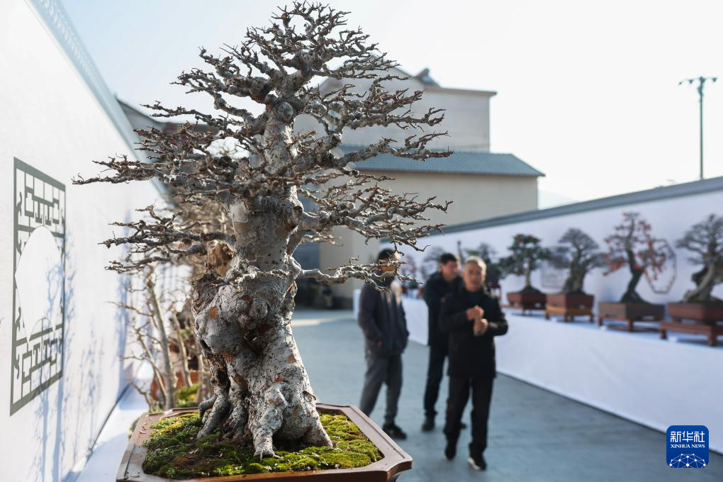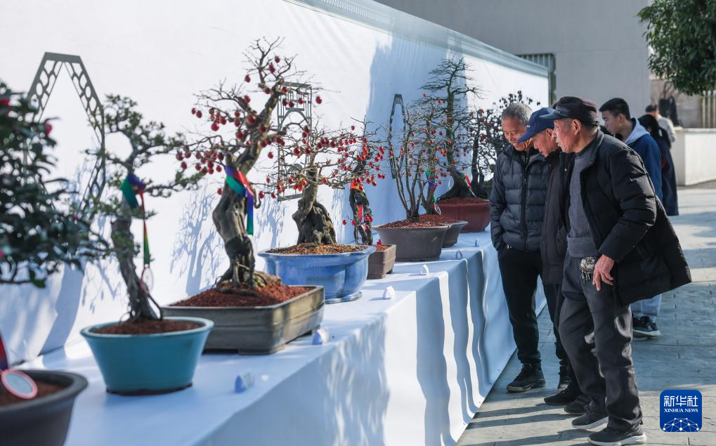 12月20日,在璜山镇溪北村冬日盆景艺术展上,村民和游客在欣赏风格各异的盆景。