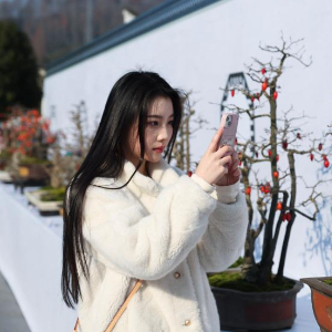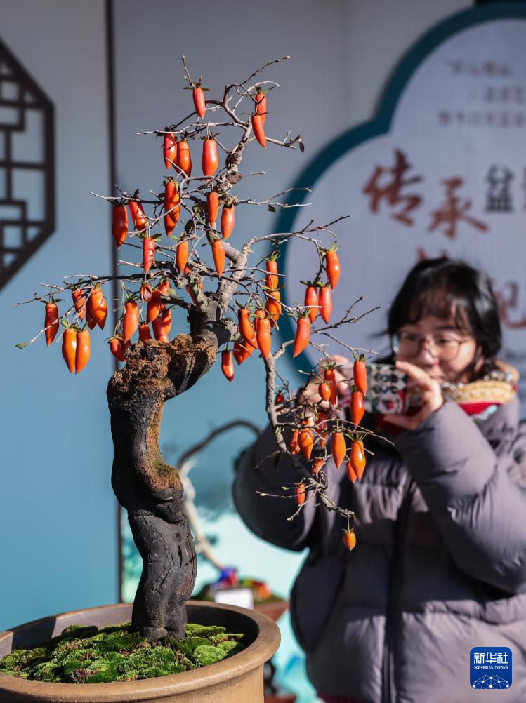 12月20日,游客在璜山镇溪北村的冬日盆景艺术展上拍照。