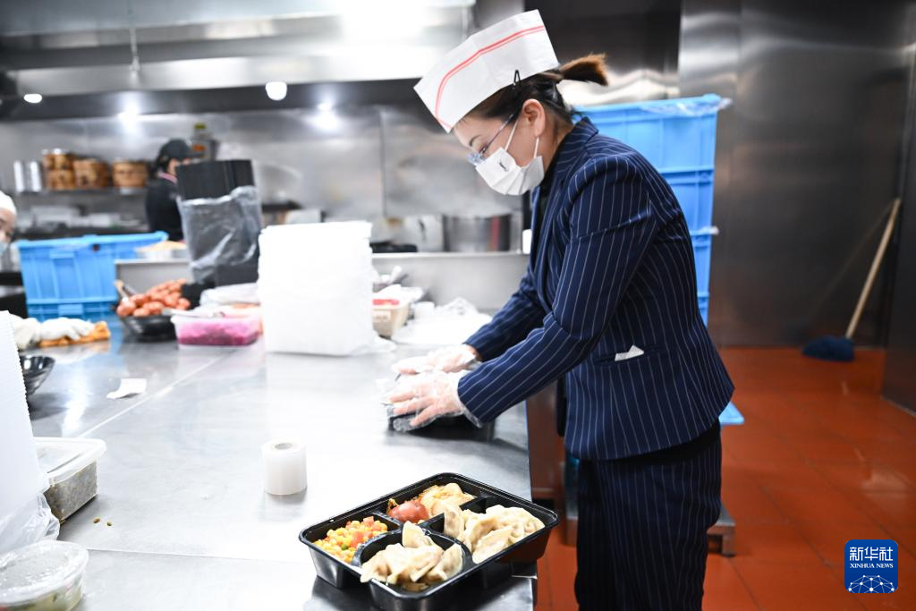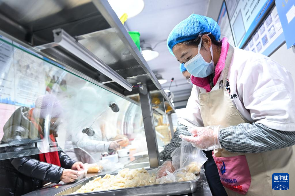 12月21日,工作人员在青海省西宁市城西区一家爱老幸福食堂为老年人配送饺子餐食。