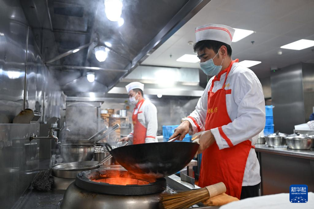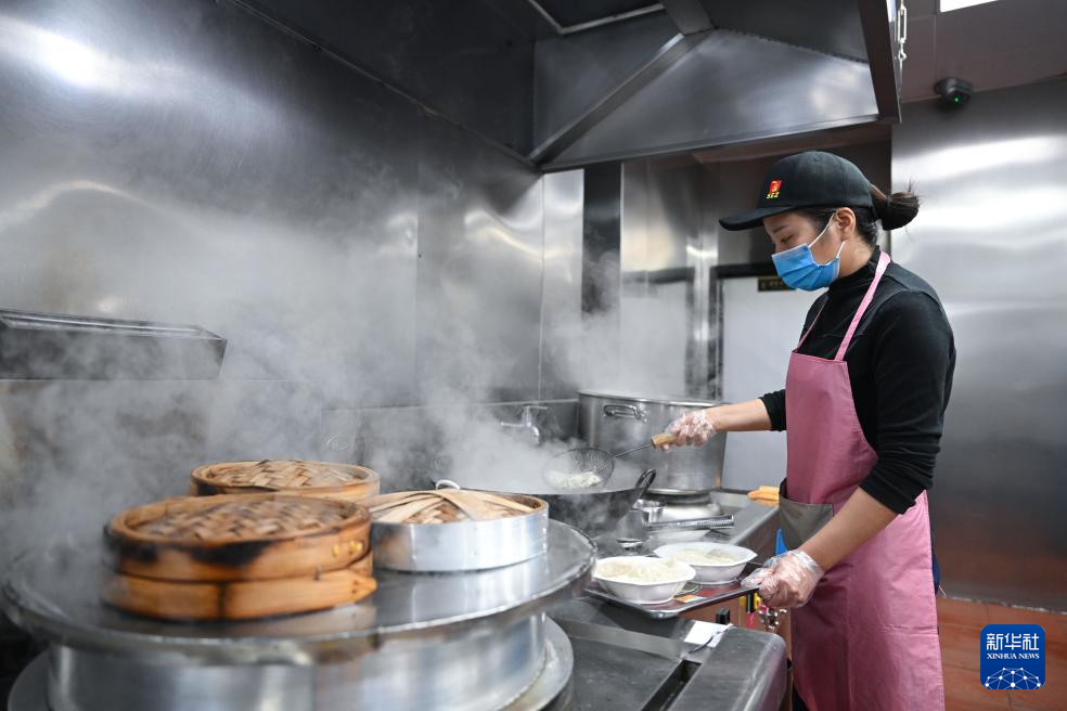 12月21日,工作人员在青海省西宁市城西区一家爱老幸福食堂为老年人做饭。