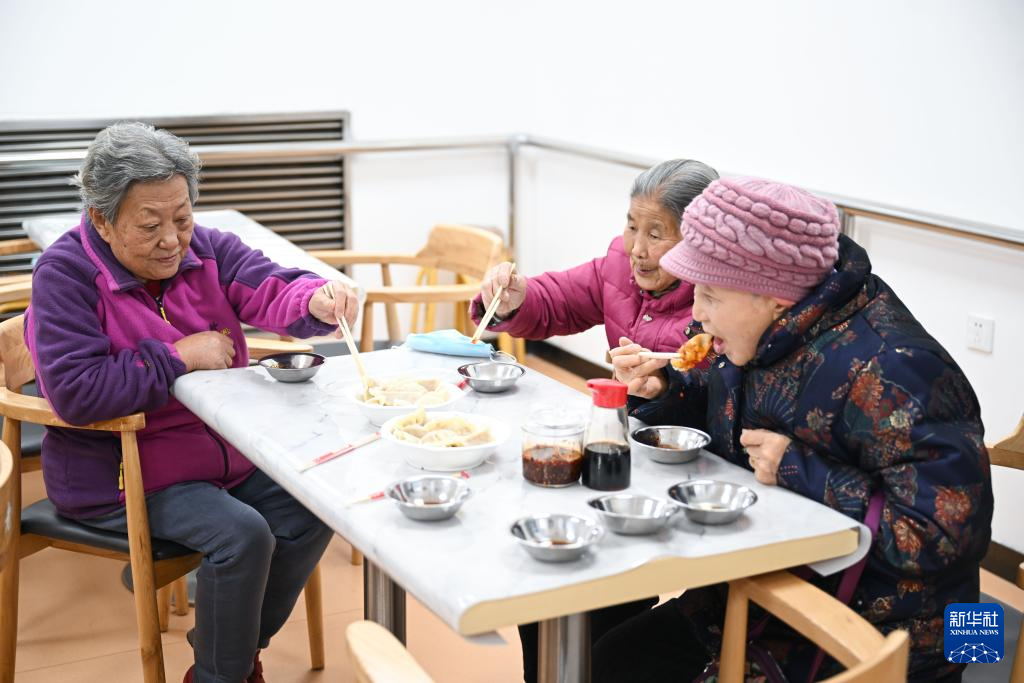 12月21日,几位老年人在青海省西宁市城西区的一家爱老幸福食堂内吃饺子。
