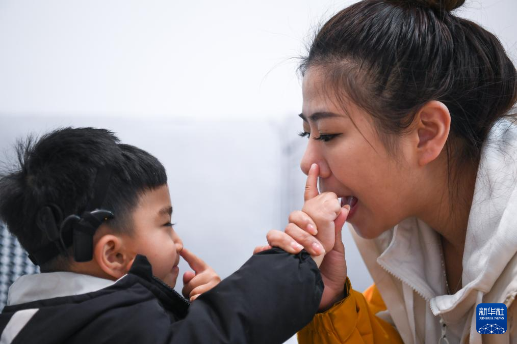 3月27日,在湖北省武汉市江夏区小葵花康复中心,特教老师李虹葭在给听障孩子上课。