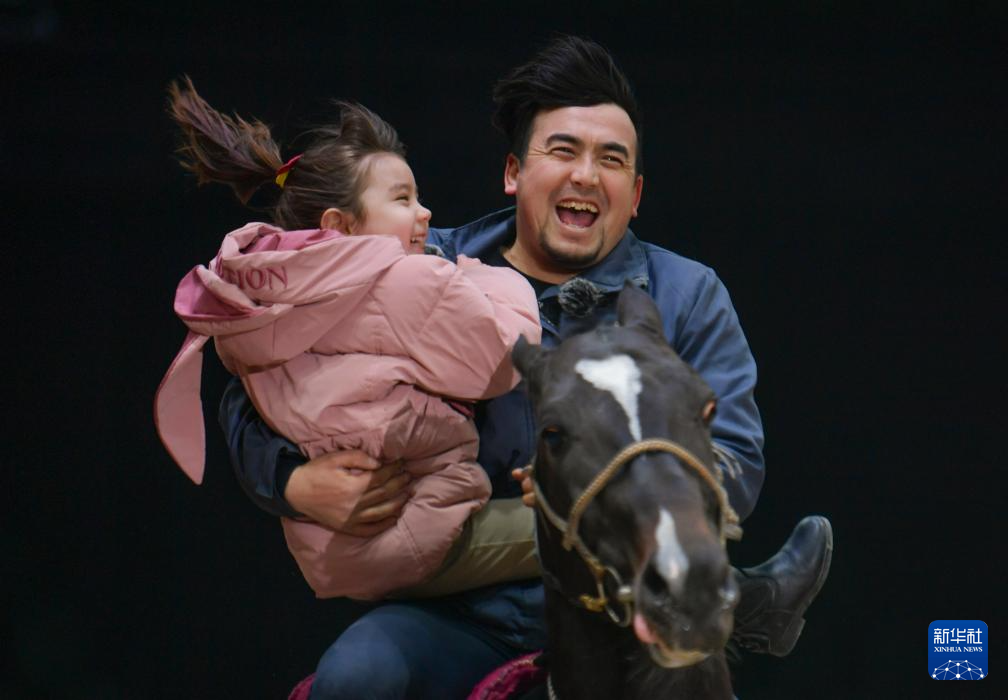 3月7日,在位于新疆昭苏的新疆野马集团古生态园汗血马基地,驯马师希尔扎提抱着4岁的女儿夏克拉一起骑马。