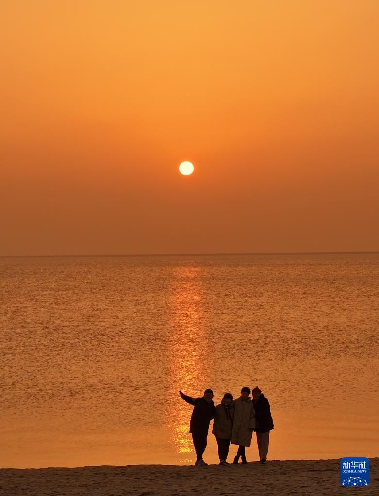 1月1日,游客在江苏省启东市圆陀角碧海银沙观赏日出(无人机照片)。