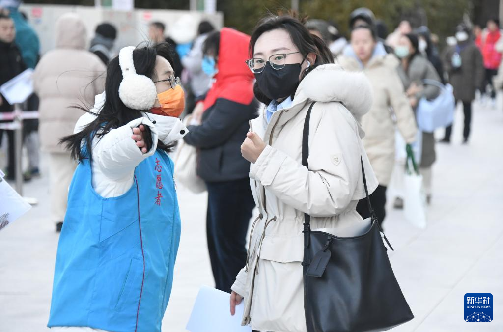 12月21日,在中国人民大学考点,志愿者(前左)解答考生问题。