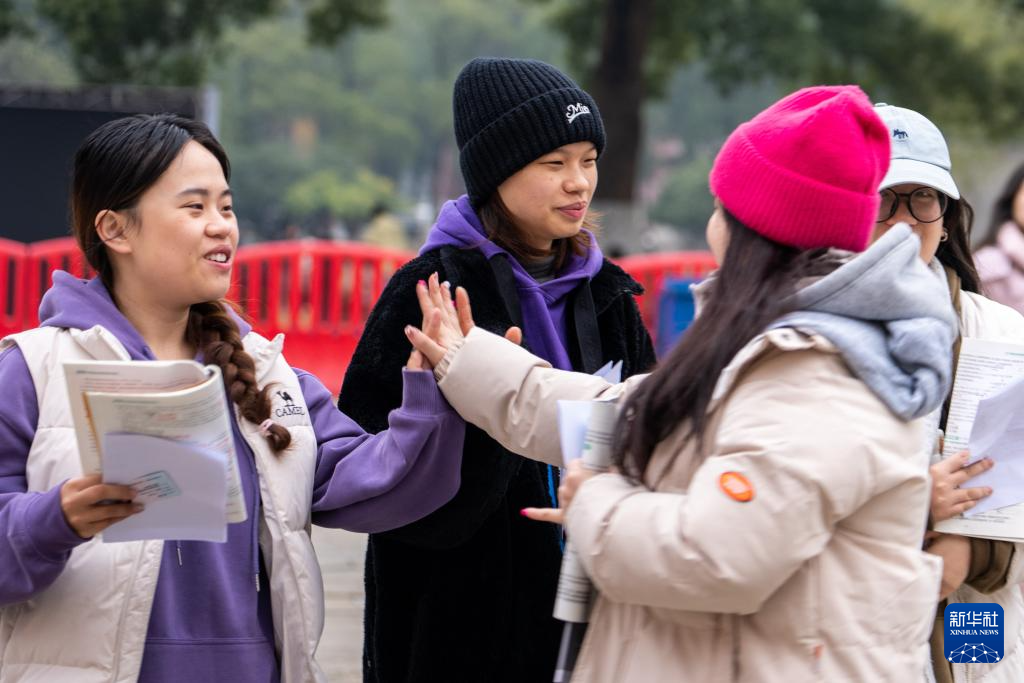 12月21日,在湖南农业大学考点,考生在考场外击掌,互相加油打气。