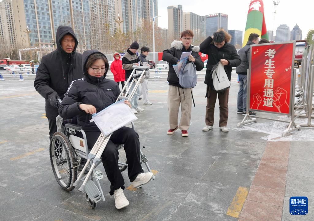 12月21日,一名坐轮椅的考生进入山东省烟台市莱山一中考点。