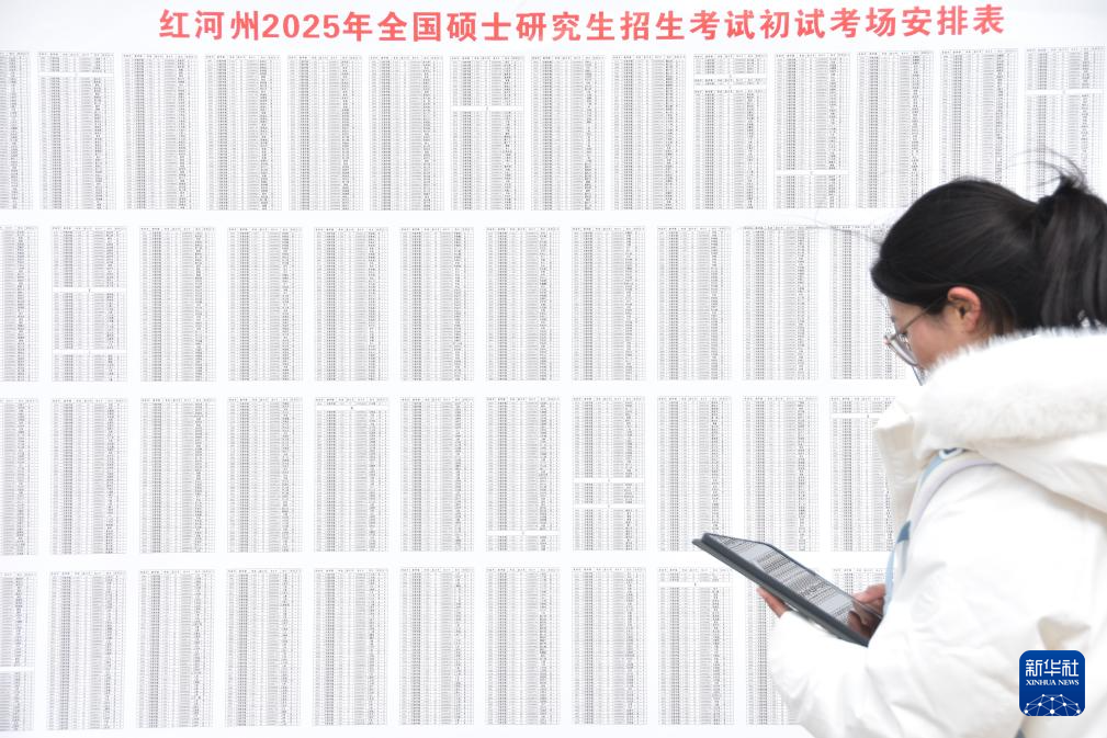12月21日,在云南省蒙自市红河职业技术学院考点,考生利用午休时间抓紧复习。