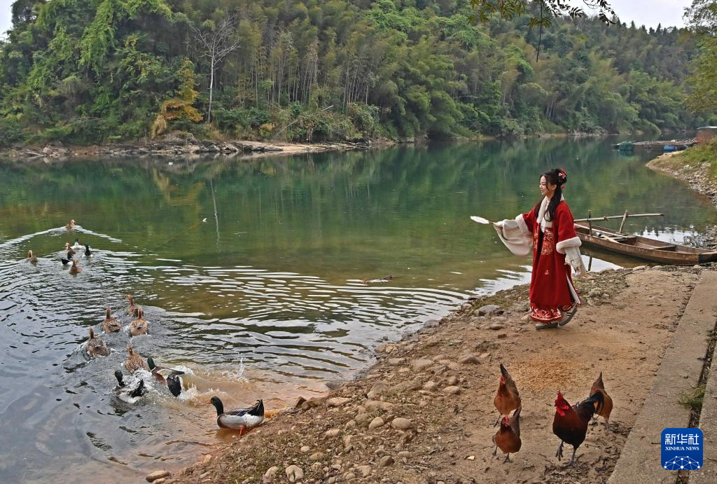 游客在广西柳州市融安县大将镇龙妙村龙妙屯浪溪江畔游玩(12月17日摄)。