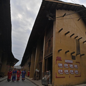 在广西柳州市融安县大将镇龙妙村,人们行走在百年老街上(3月25日摄)。