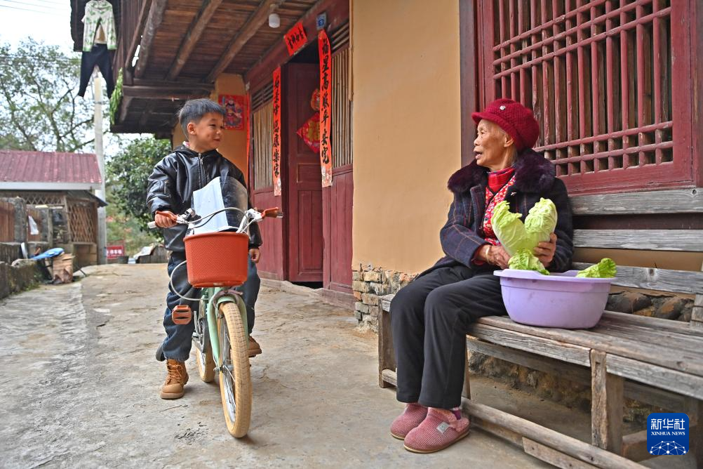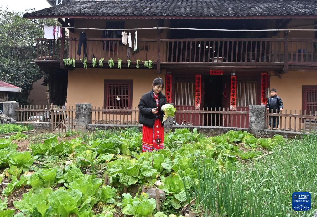 在广西柳州市融安县大将镇龙妙村龙妙屯,村民在择菜(12月17日摄)。