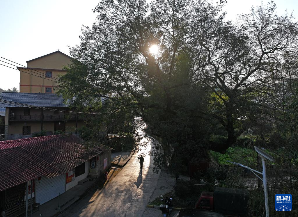 一名村民行走在广西柳州市融安县大将镇龙妙村龙妙屯枫杨树下(12月18日摄,无人机照片)。