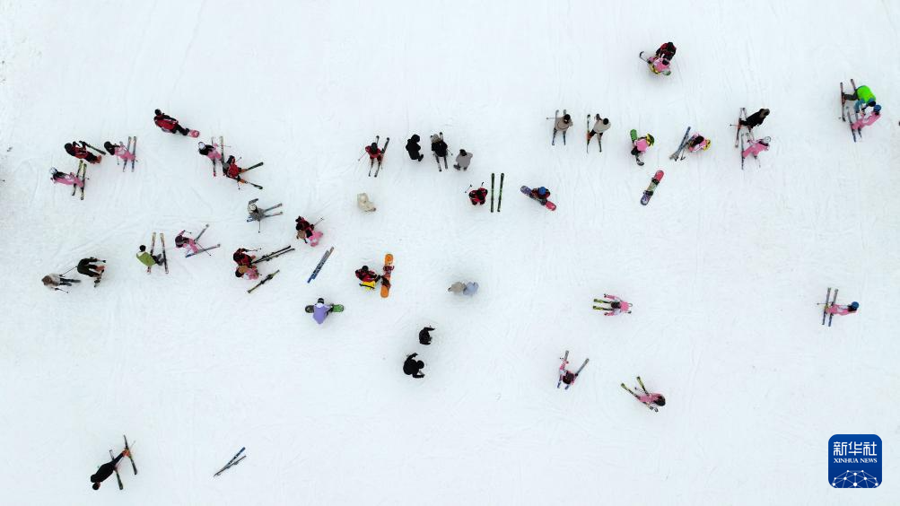12月22日,游客在银川市阅海滑雪场体验冰雪乐趣(无人机照片)。