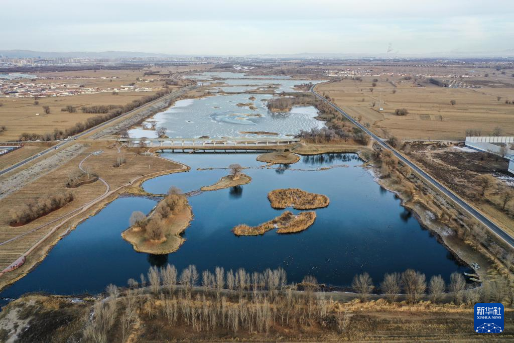 这是12月18日拍摄的呼和浩特市大黑河郊野公园“千岛湖”风景区(无人机照片)。