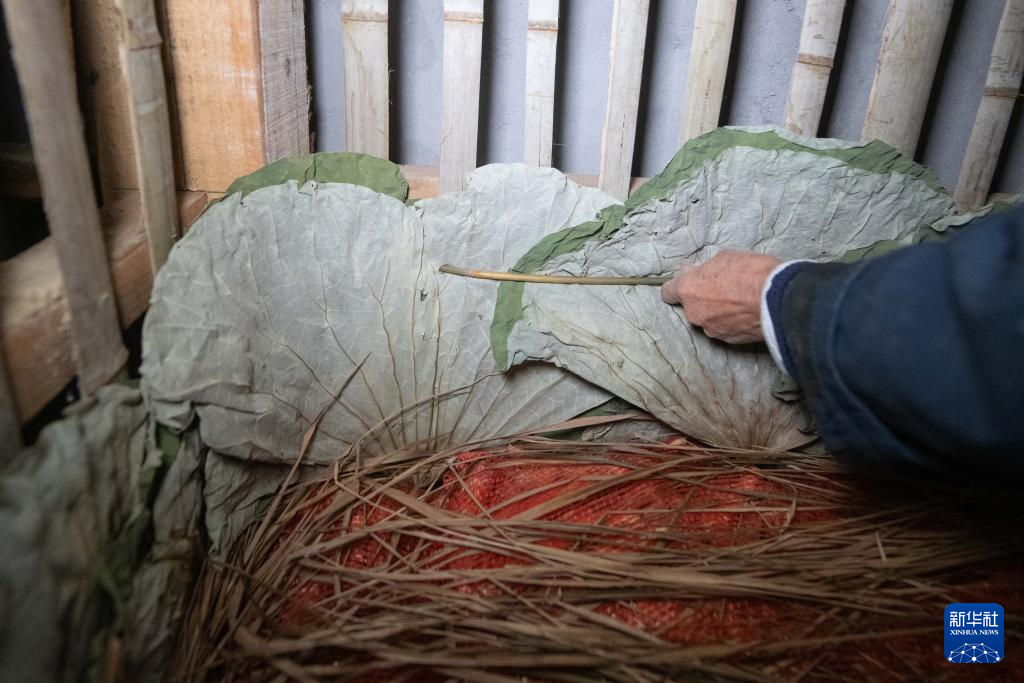 11月7日,当日是立冬,在安徽省铜陵市郊区大通镇大院村的一座姜阁里,村民用荷叶分隔放置其中的姜种。