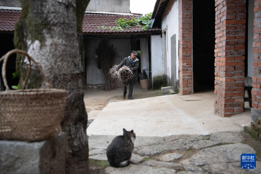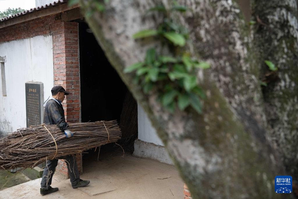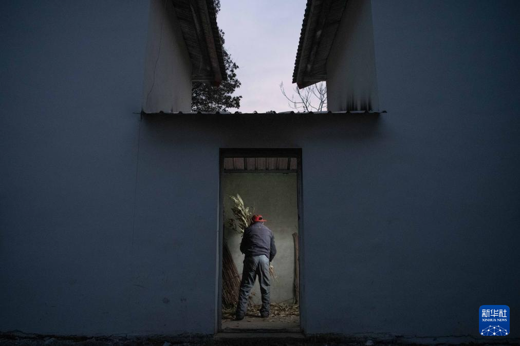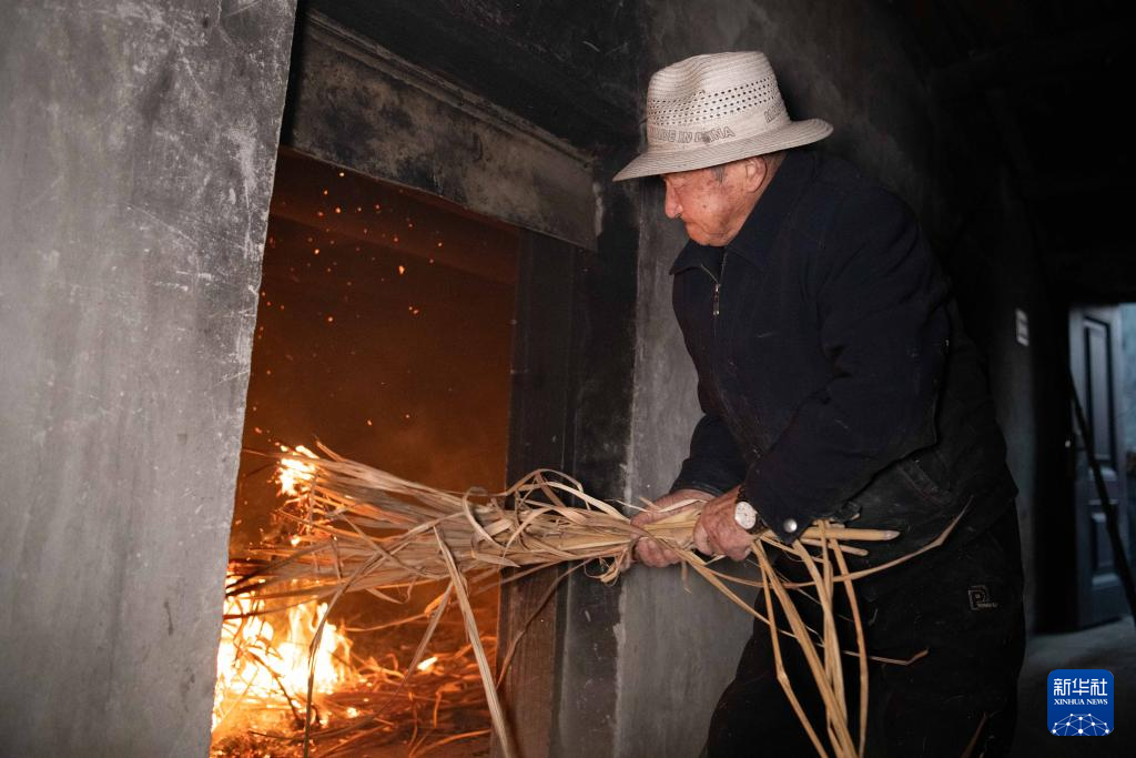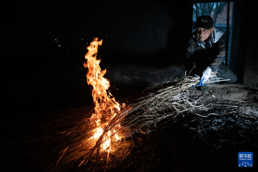 11月24日,在安徽省铜陵市义安区天门镇五峰村,“姜把式”盛义武准备使用芭茅草生火,为存放在姜阁里的姜种增温保暖。