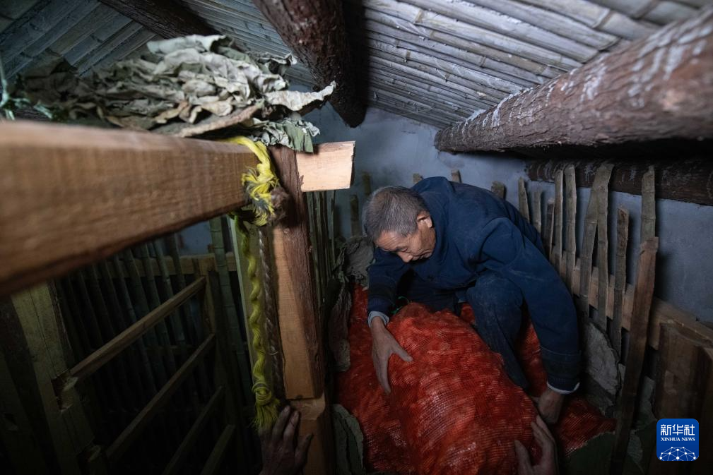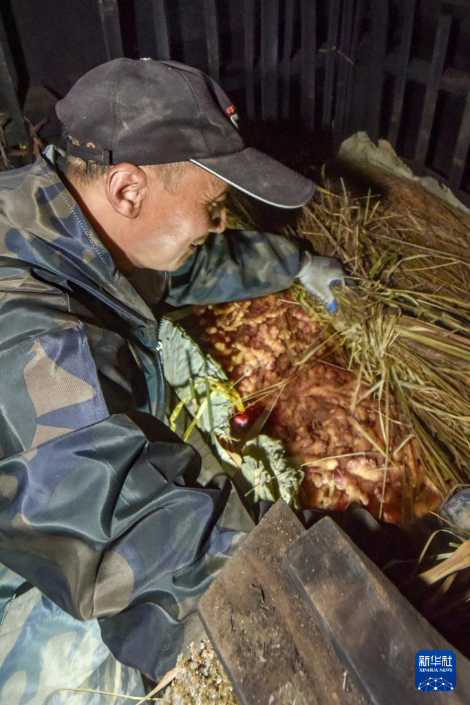 11月11日,在安徽省铜陵市义安区天门镇五峰村,“姜把式”盛义武把姜种放入在姜阁中。