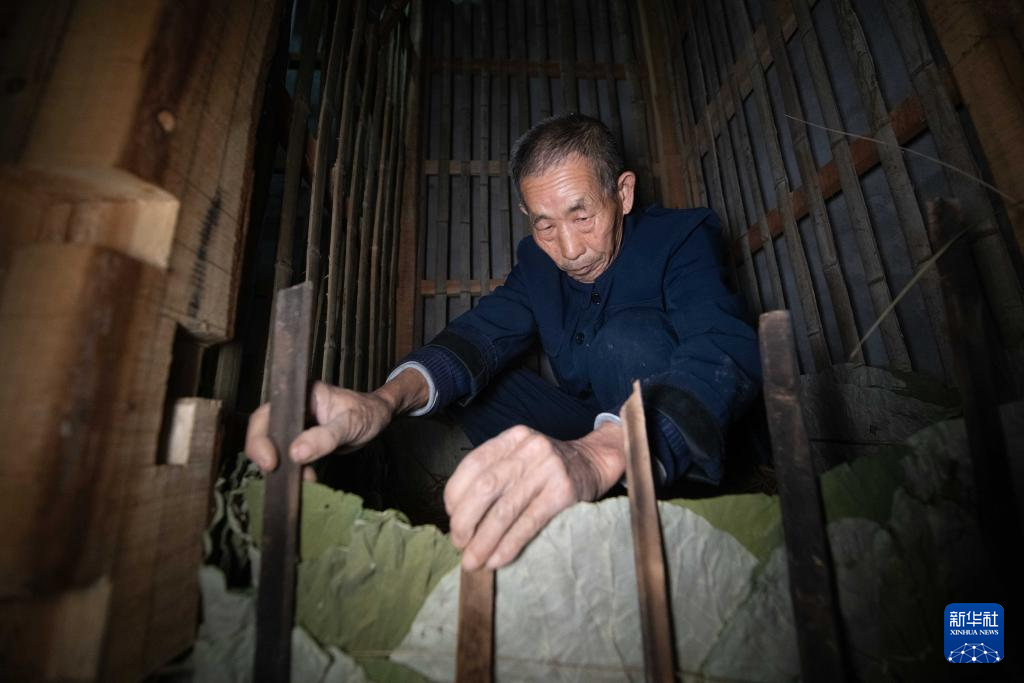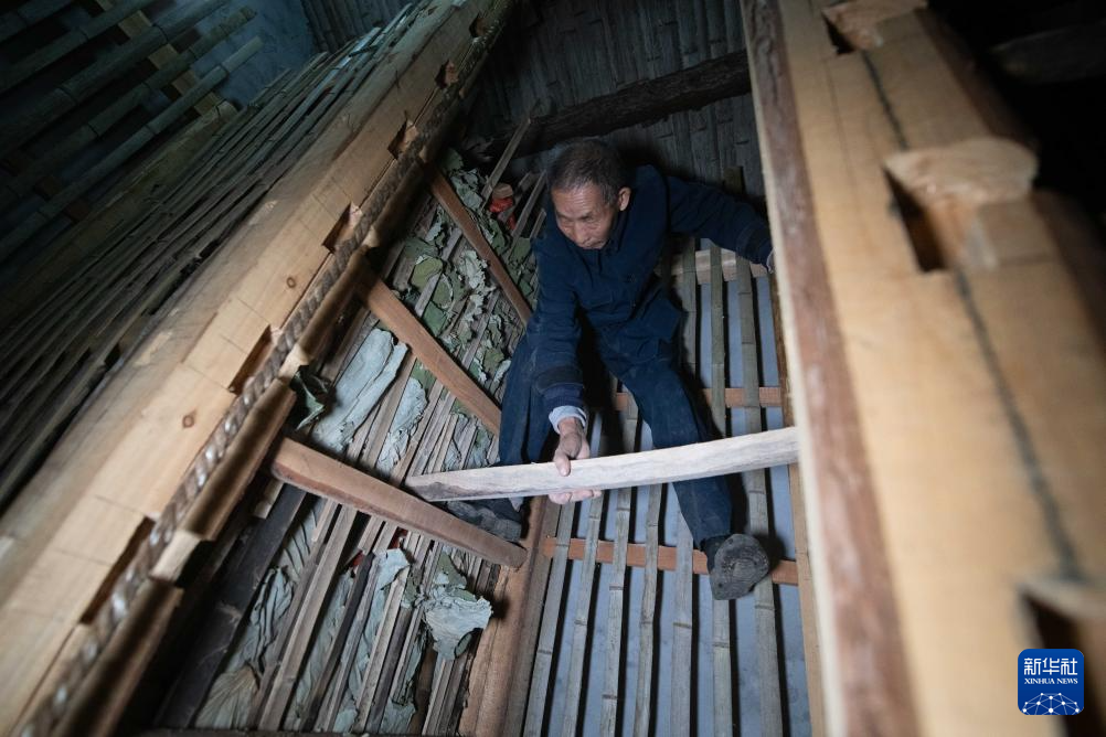 11月23日,在安徽省铜陵市义安区天门镇五峰村,“姜把式”盛义武在查看姜阁内部的情况。