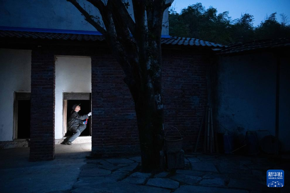 11月11日,在安徽省铜陵市义安区天门镇五峰村,“姜把式”盛义武整理挂在姜阁外墙上的温湿度计。