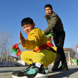 12月22日,南皮县冯家口镇车官屯小学学生在排练沧州落子。