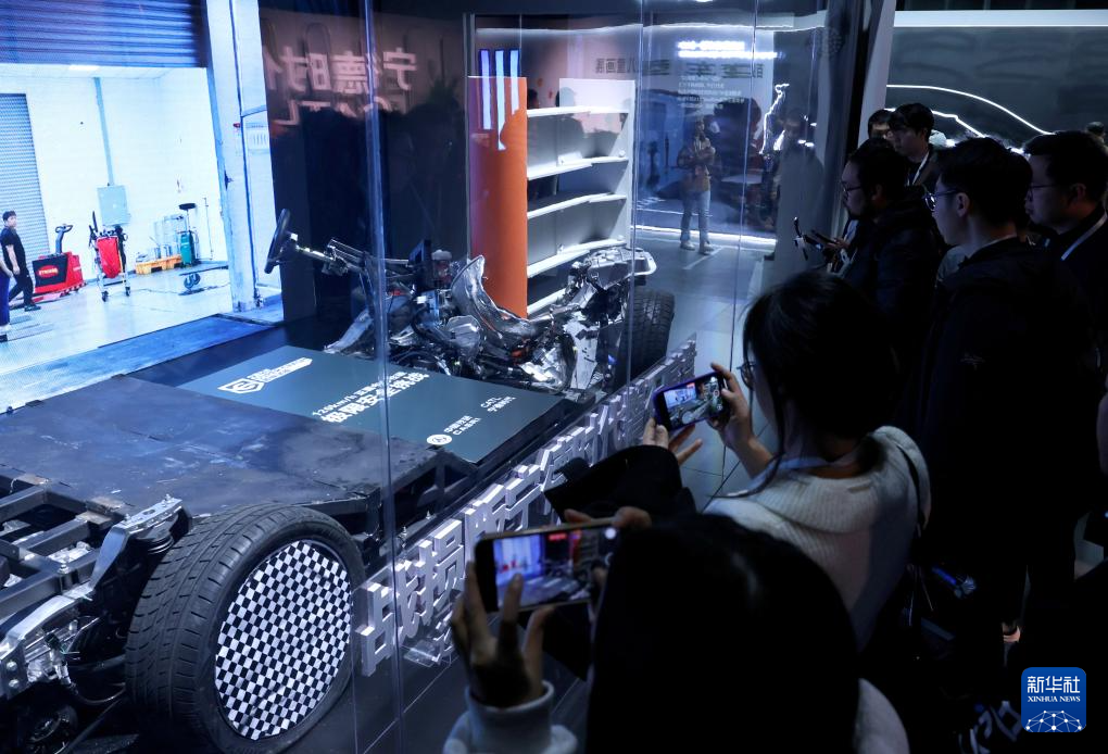 12月24日,嘉宾在发布会现场观看经过时速120公里中心柱碰试验的“战损版”磐石底盘。