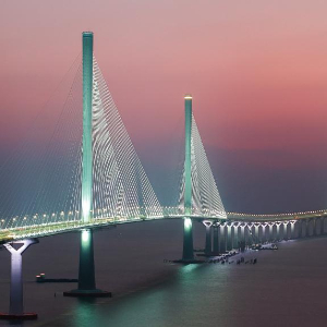 暮色中的黄茅海跨海通道高栏港大桥(左侧双主塔)和黄茅海大桥(右侧三主塔)(2024年12月7日摄,无人机照片)。