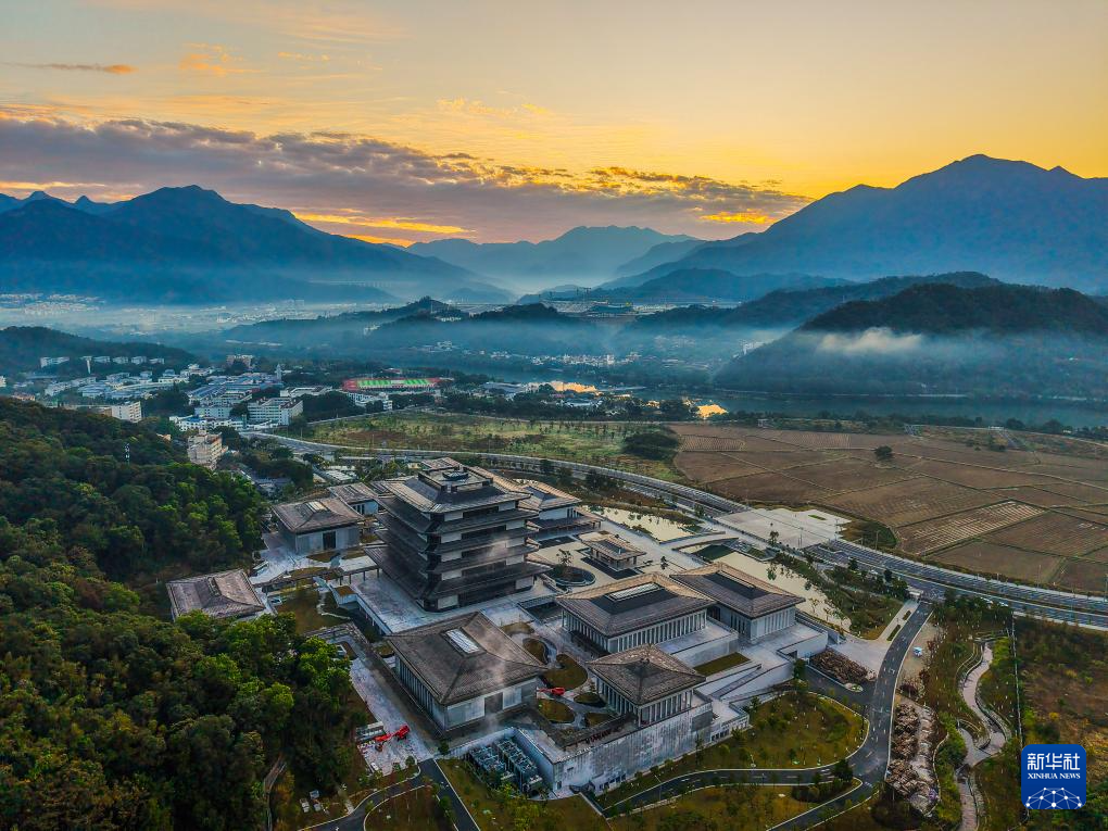 沐浴在晨曦中的广州国家版本馆(2024年12月3日摄,无人机照片)。
