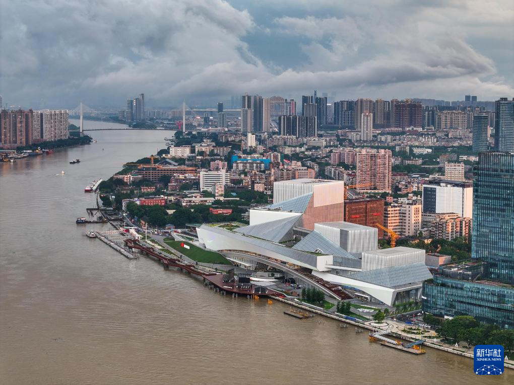 白鹅潭大湾区艺术中心宛如“文化巨轮”扬帆珠江(2024年4月27日摄,无人机照片)。