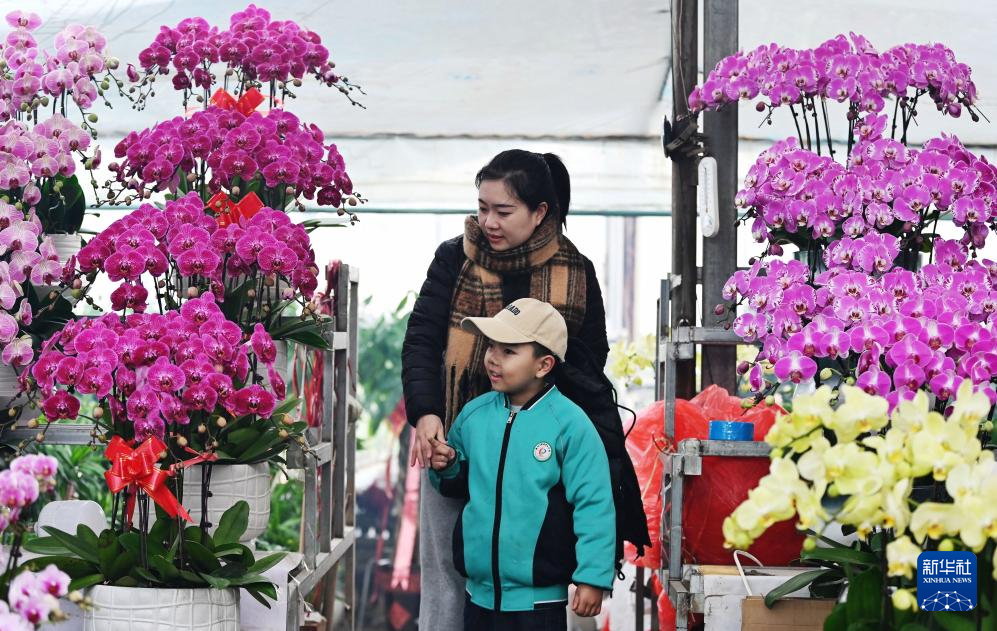 新年临近,各地花卉市场日渐火爆,人们选购花卉装饰居室,迎接新年。