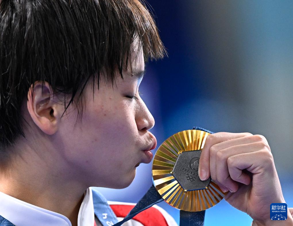 这是2024年8月6日,中国选手全红婵在巴黎奥运会跳水项目女子10米台决赛颁奖仪式上亲吻金牌。