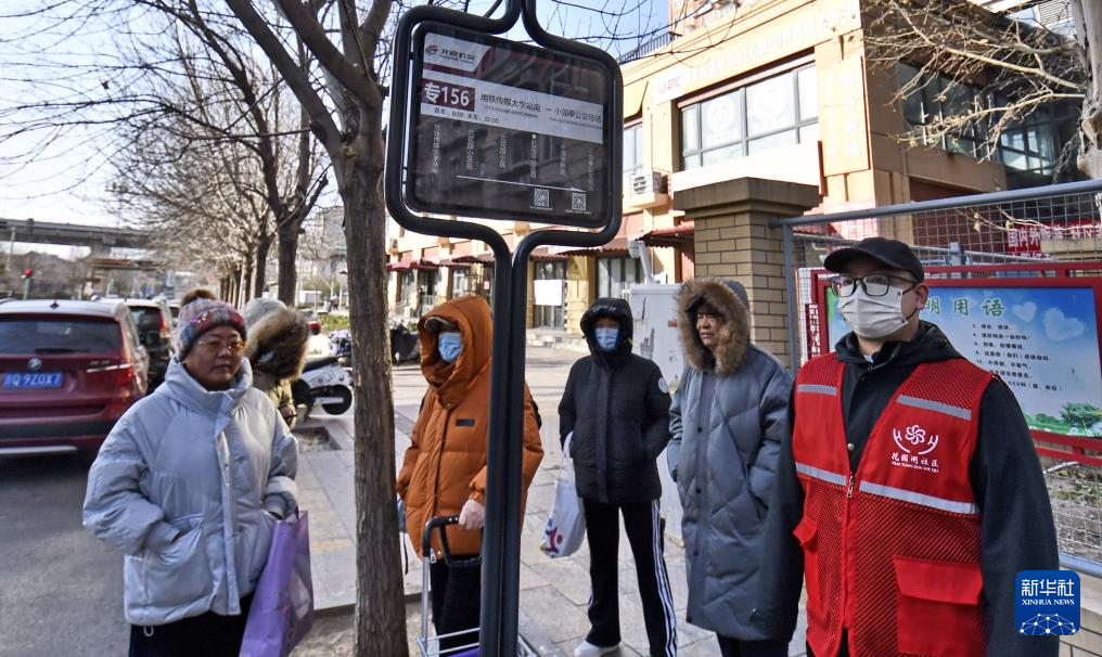 12月25日,朝阳区高碑店乡花园闸社区的志愿者在公交站引领居民候车。