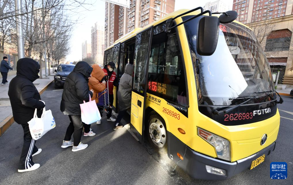 12月25日,朝阳区高碑店乡花园闸社区的居民乘坐便民小型公交车出行。