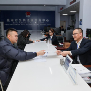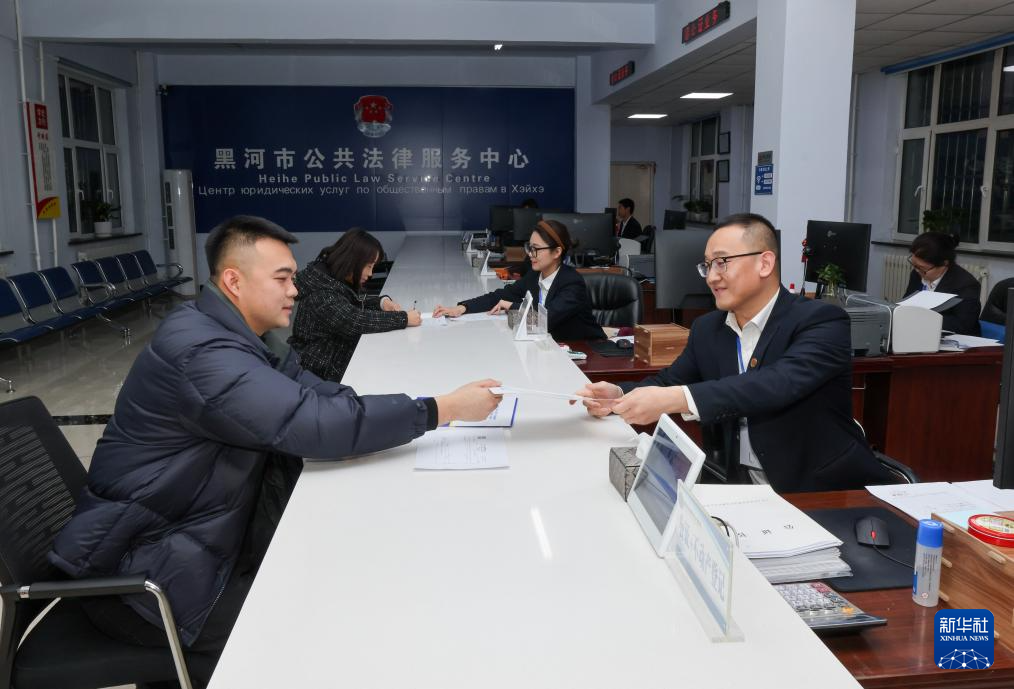 12月10日,黑龙江省黑河市公共法律服务中心的工作人员在为涉外企业办理业务。