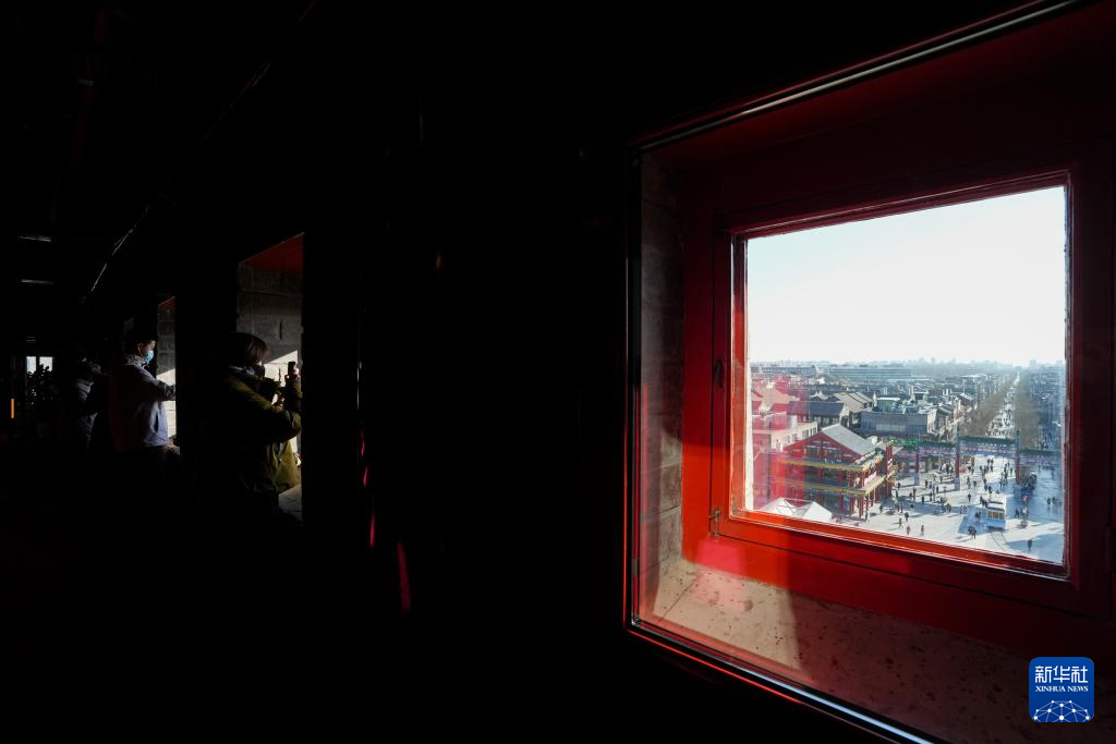 12月26日,参观者在正阳门箭楼内拍摄前门大街的风景。