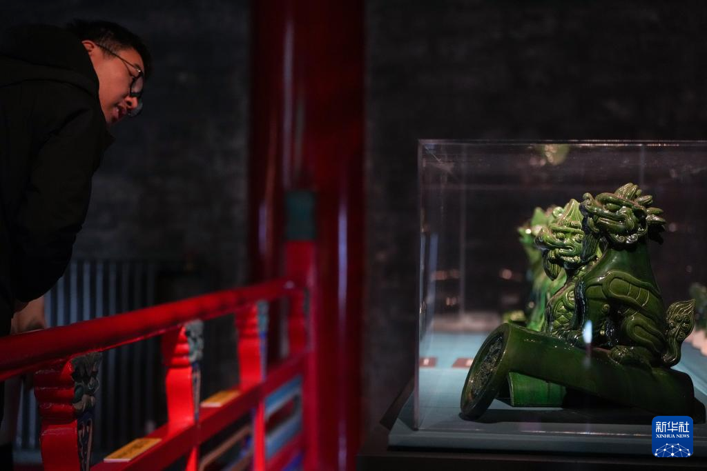 12月26日,参观者在正阳门箭楼内参观展出的正阳门脊兽。