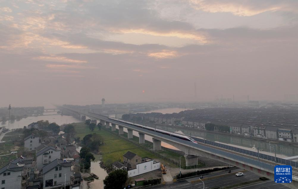 12月26日,列车清晨驶过沪苏湖高铁苏州段(无人机照片)。