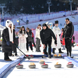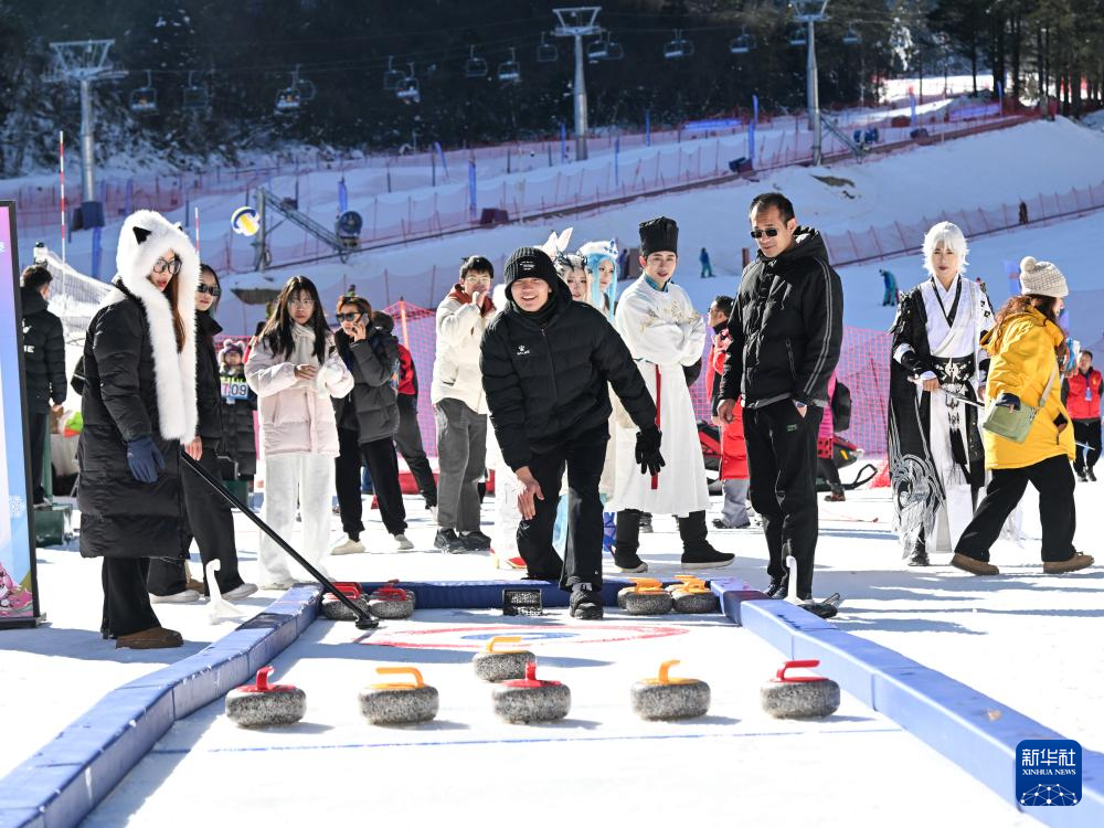 12月27日,在汶川县羌人谷滑雪场,游客体验雪地冰壶项目。