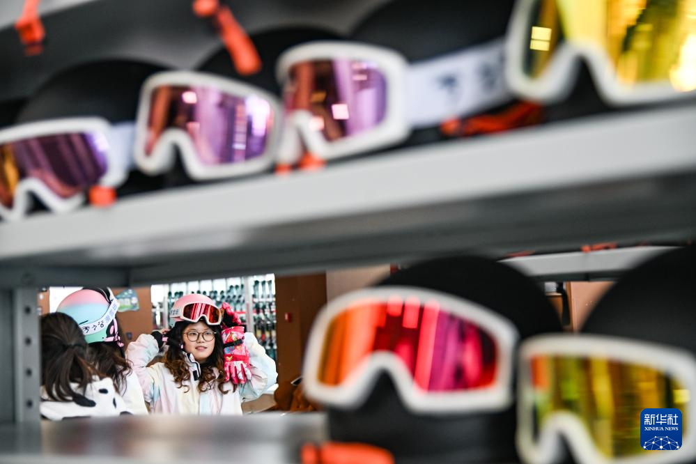 12月27日,在汶川县羌人谷滑雪场,滑雪爱好者租赁滑雪装备。